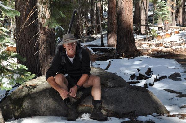 Стежка була зовсім нескладна і йшла практично по рівному місці з невеликими підйомами і спусками. Через деякий час я догнав того самого дядька з фотоапаратом, який присів, щоб привести до порядку своє взуття. Я запитав дозволу сфотографувати його, бо не кожного дня можна побачити чоловіка у шортах на снігу. Він погодився і ми розговорилися. Виявляється, він був у шортах не тому, що такий здоровий і загартований, а тому, що не сподівався снігу і не мав іншого одягу. А приїхав він аж із Сан Франциско.