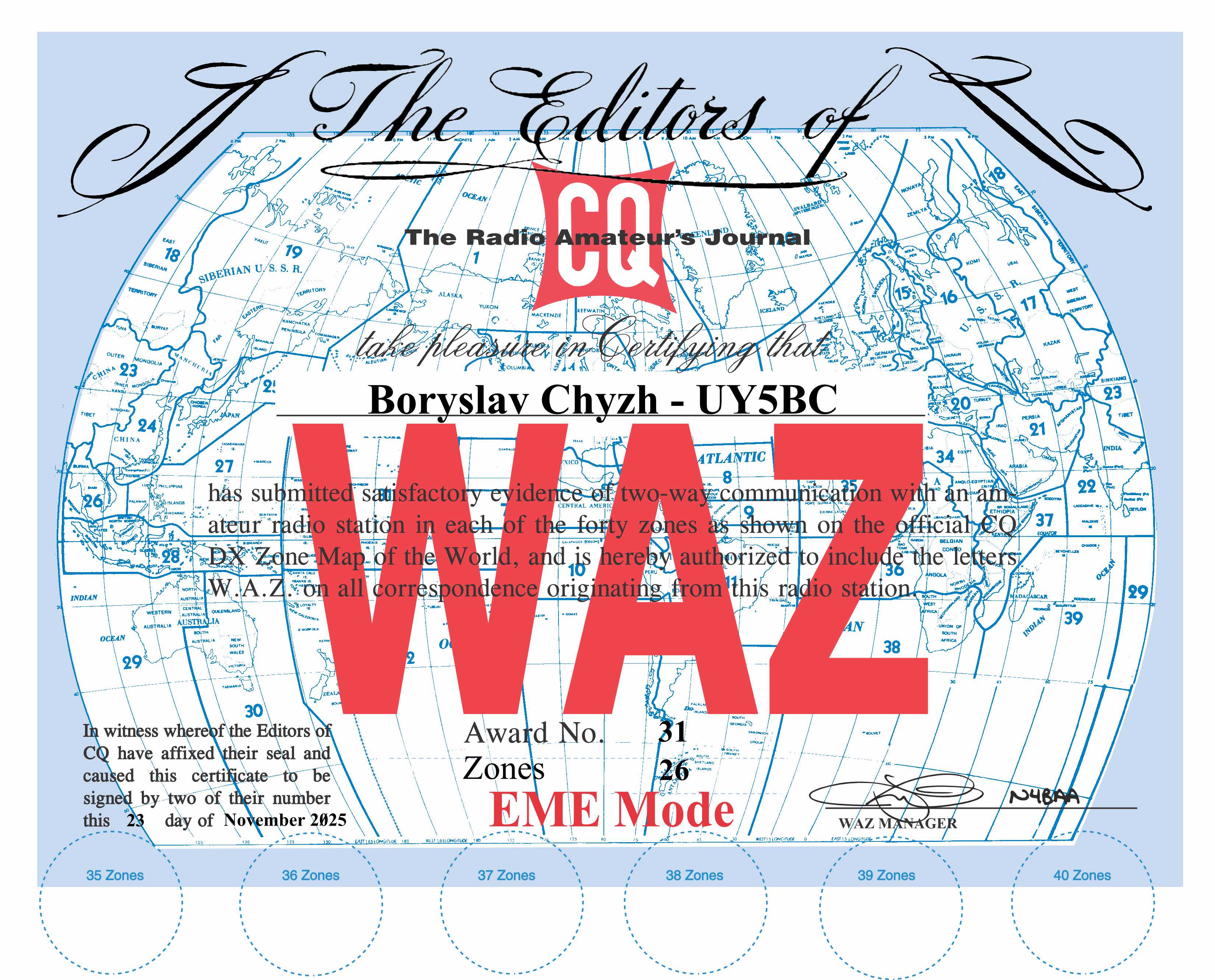 Не зовсім було зрозуміло мені як підтвердити це та як правильно оформити заявку. З цими питаннями звернувся до Jose Castillo N4BAA. Jose надзвичайно швидко допоміг це все вирішити і вчора, 23.11.2025 р. я отримав мій, такий важливий для мене, диплом CQ WAZ EME Award.
