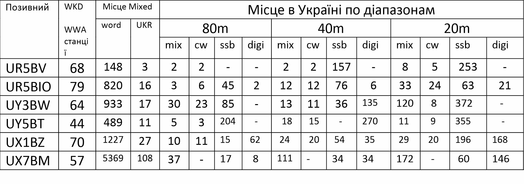 Від Тернопільщини в акції працювали: UR5BV, UR5BIO, UY3BW, UY5BT, UX1BZ, UX7BM. Індивідуальні результати наших аматорів на основних діапазонах та по видах роботи наведені нижче в таблицях :