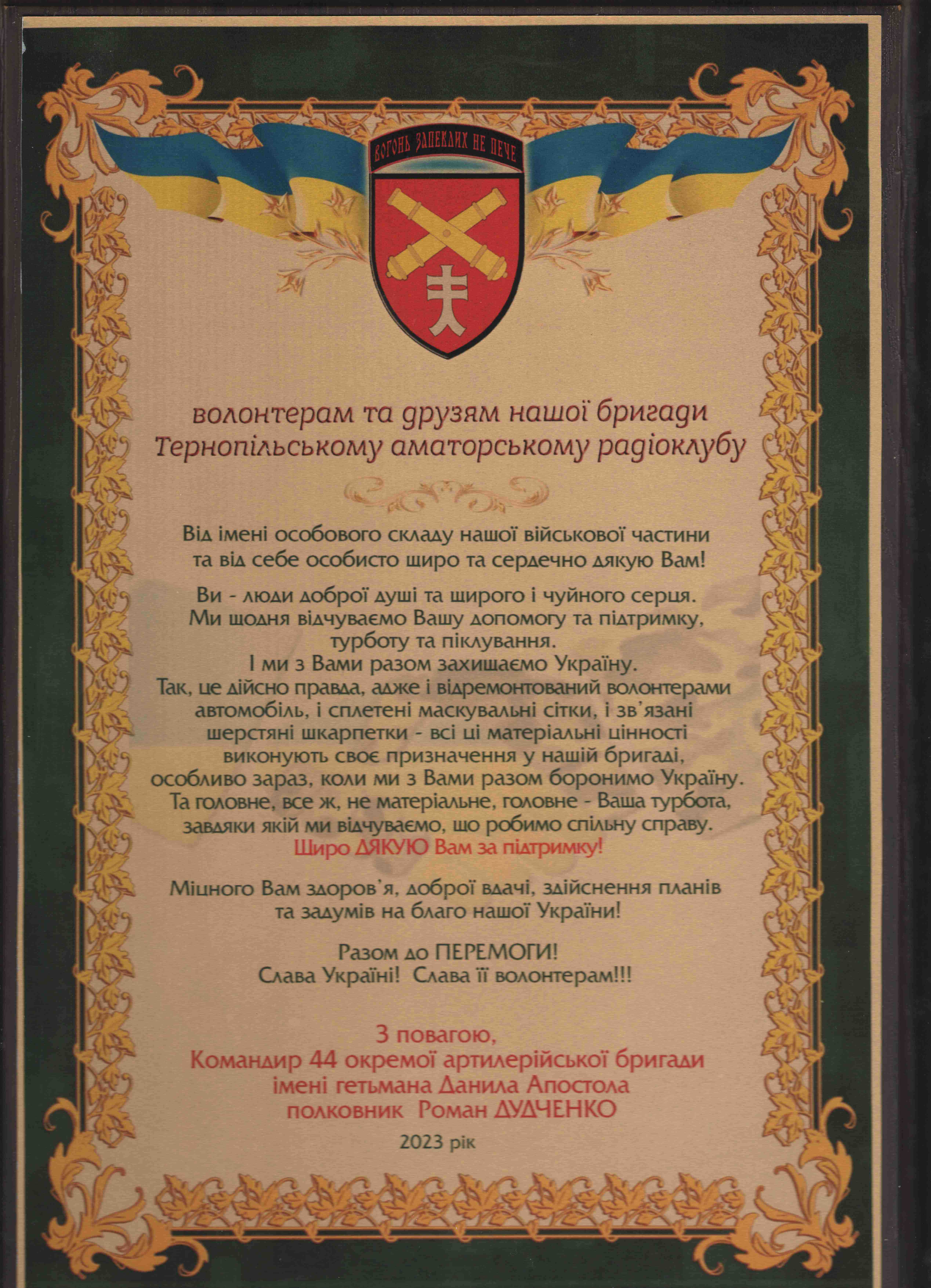 Приємною несподіванкою є отримання з фронту від 44- ОАБр Подяки.