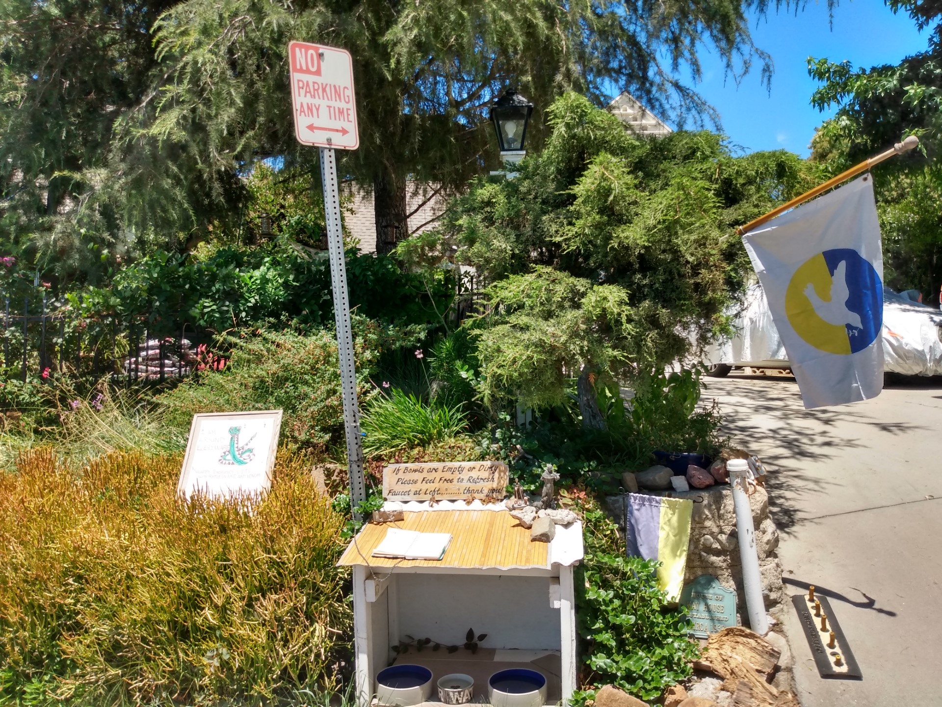 Але на такій спеці довго витримати не вдалося і десь через 45 хвилин я вже пішов вниз. Так я знову зупинився біля прапора з голубом миру і детальніше роздивився експозицію. Злівої сторони було попередження  про гримучих змій. Знизу була якась вода для пиття - ніби капличка. А справа внизу був невеликий український прапор, що вже досить вицвів на сонці. Посередині був відкритий зошит, де туристи щось записували.