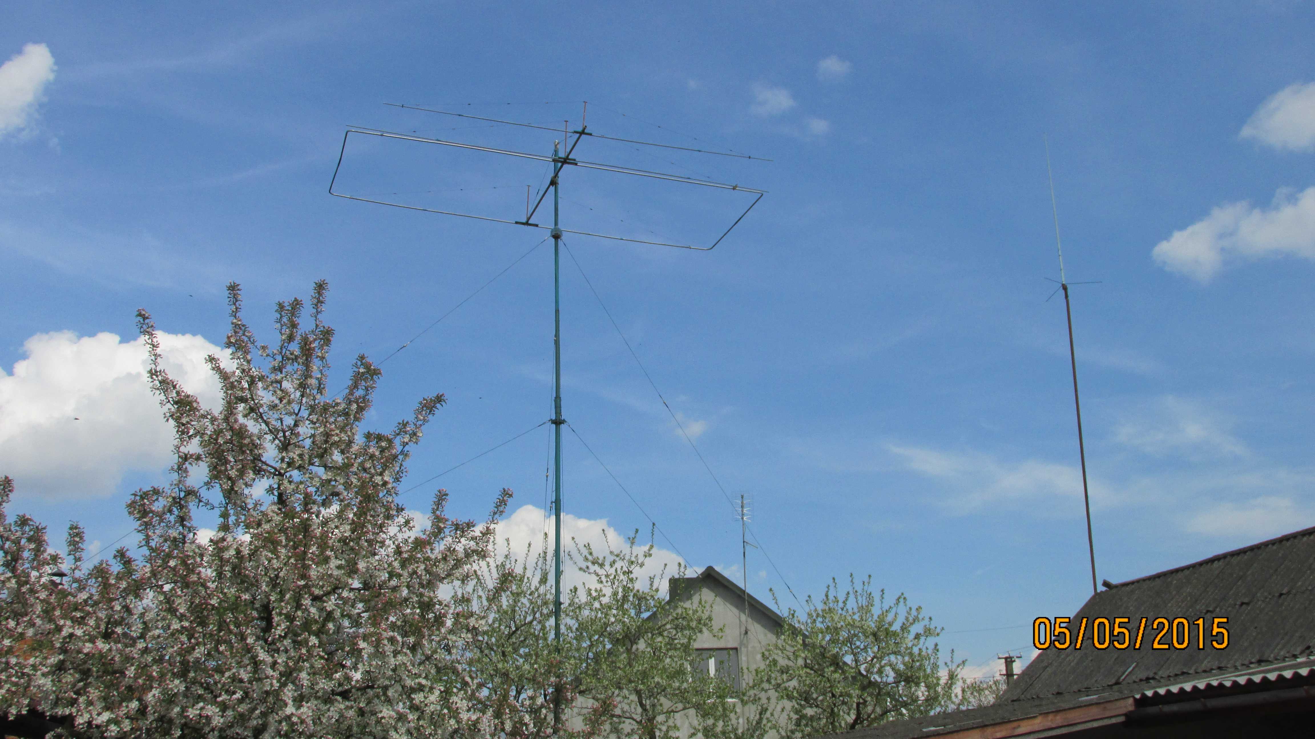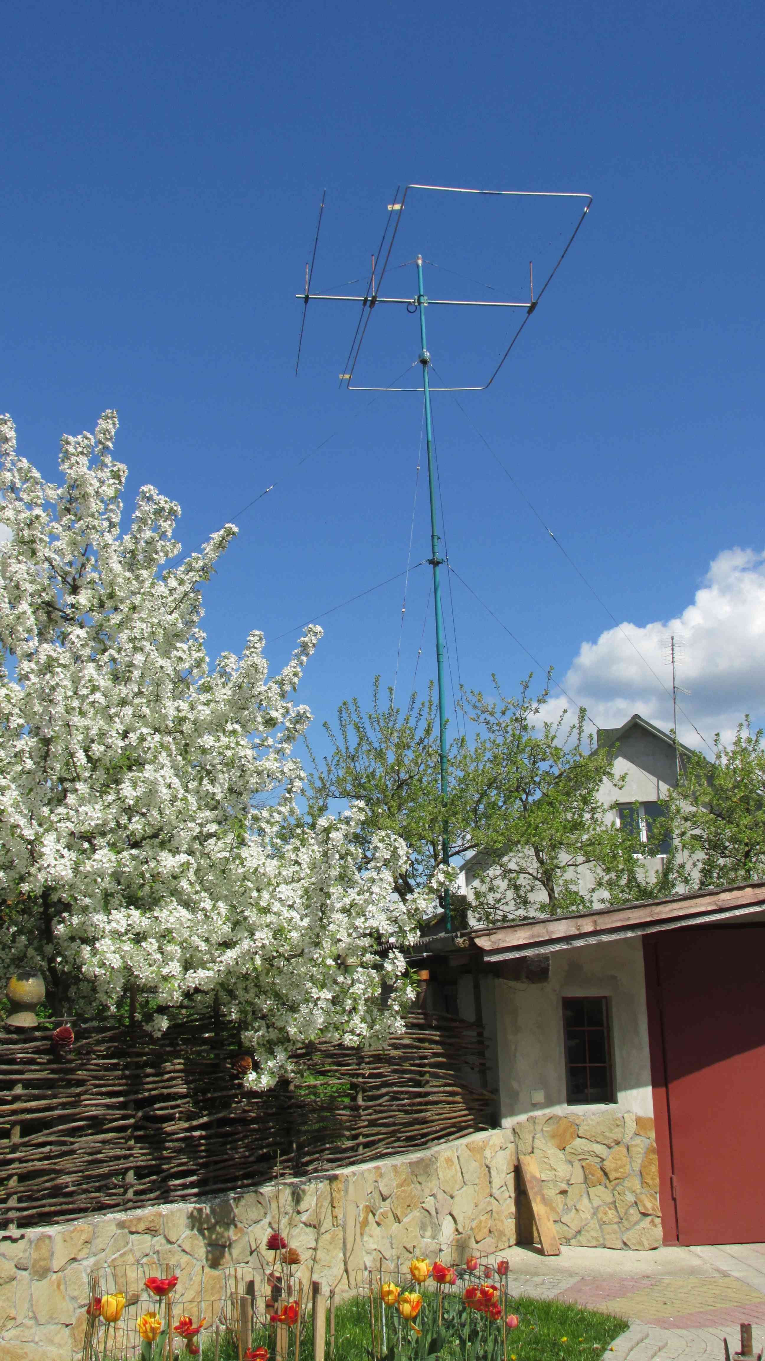 Вся антена розміщена на вертикальній мачті загальною висотою біля 9,6 м та діаметром від 65 мм внизу до 50 мм вверху. Сама мачта має 2 яруси розтяжок, 2 підшипники, стоїть на опорному підшипнику та приводиться в обертання саморобним механізмом знизу від основи. Конструкція виявилась дуже міцною, не вібрує при сильних вітрах та декілька років вже прослужила без проблем.