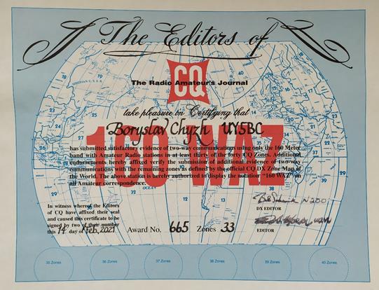 33 підтверджених ( всього їх 40 ) WAZ зони на діапазоні 160 метрів.